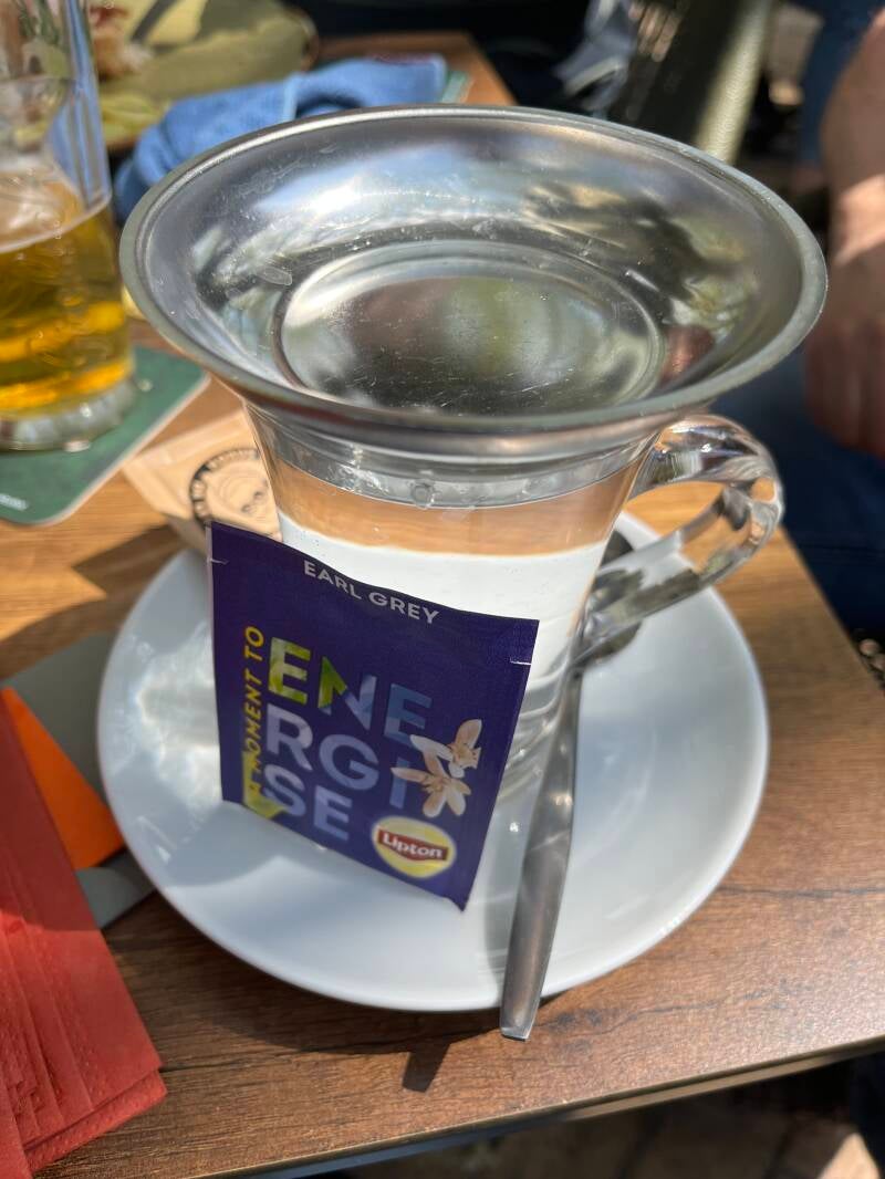 Locatie aan de Kralingse plas een Earl Grey besteld. Bestel je Gemberthee, dan wordt de gember gesliced in je glas geserveerd. De foto is een beetje paars, ligt niet aan de thee wel aan de verlichting die sfeer brengt in de serre van het restaurant.